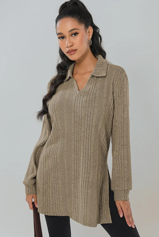Ribbed Knit V Neck Collared Split Hem Tunic