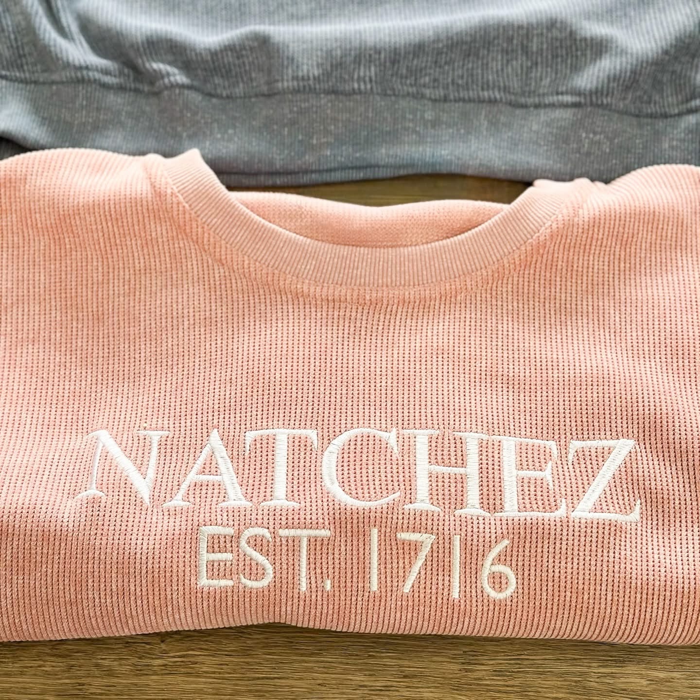 The Kaelor & Co. Natchez Sweatshirt is constructed of 100% polyester and features a ribbed texture with a washed look giving it that comfy lived-in feel. Featuring "Natchez EST 1716" across the front, this sweatshirt is the perfect addition to your wardrobe and perfect Natchez souvenir or token to show your hometown love.